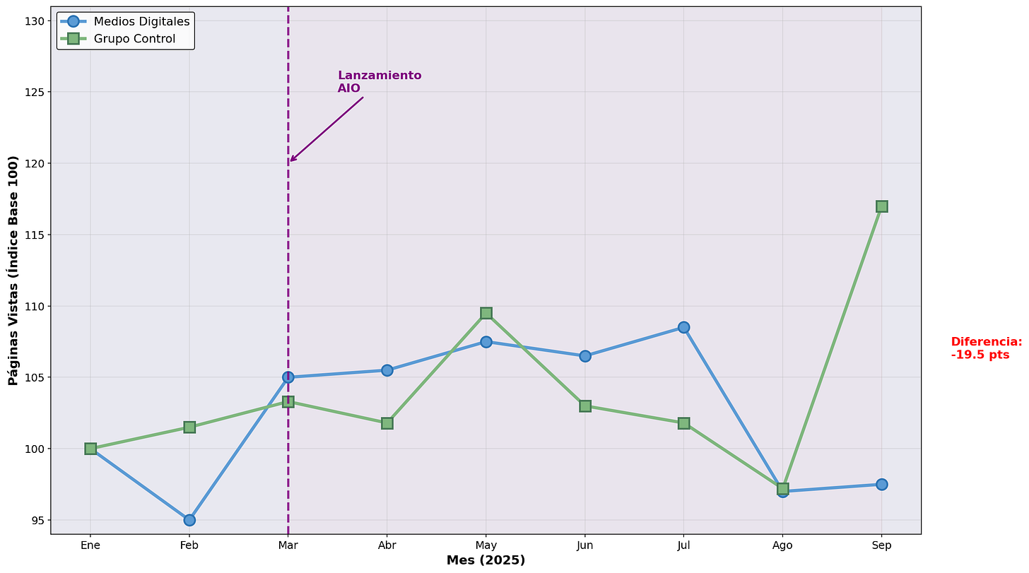💡 Datos frescos sobre cómo están afectando los resúmenes de IA al tráfico de los medios españoles. Spoiler: hay una caída media del 10%. Los medios que ofrecen información genérica sufren más, mientras que los que aportan datos únicos o análisis profundos resisten mejor gracias a su “calidad editorial”. Toca diferenciarse o morir.